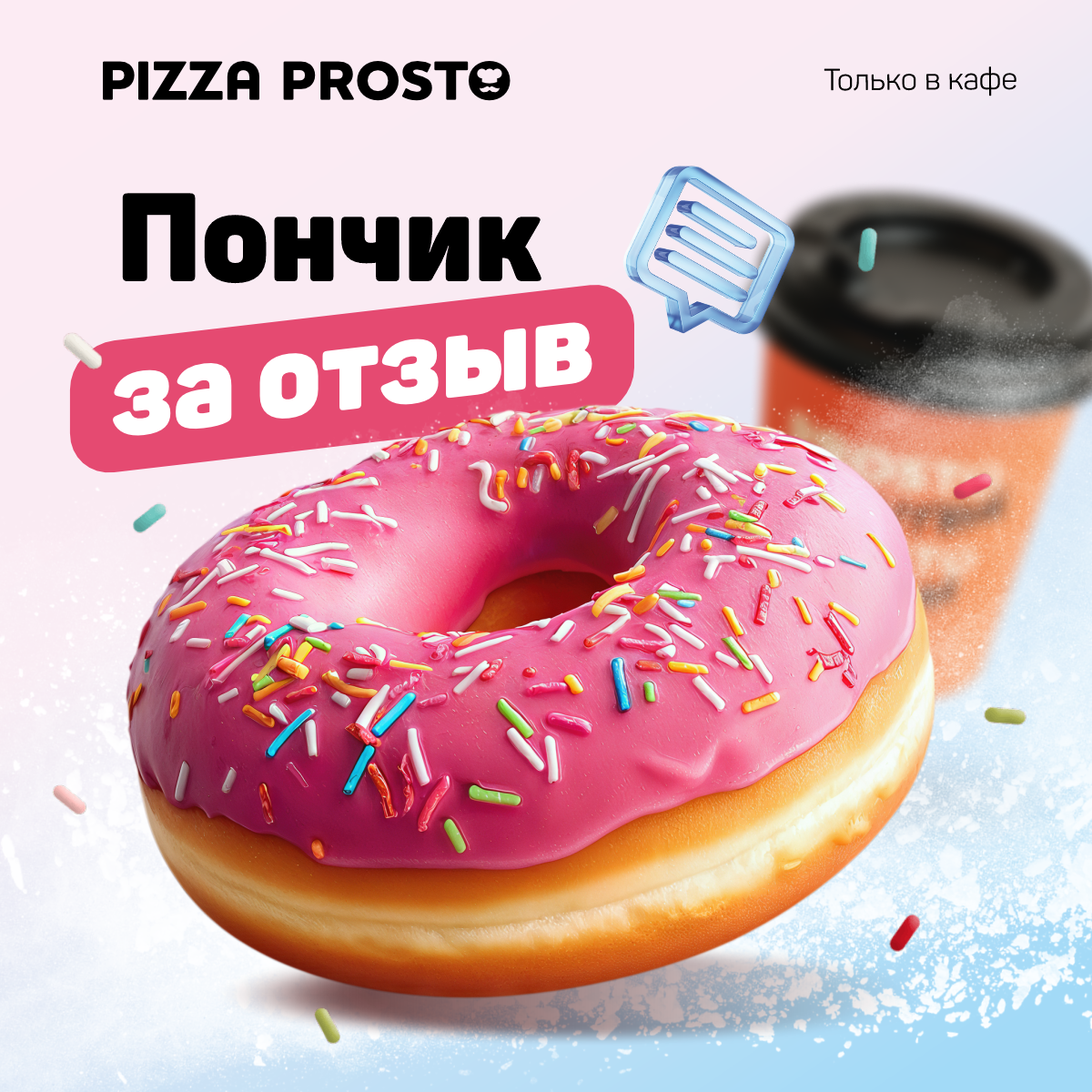 - Напиши своё мнение о Pizza Prosto в Яндекс (карта) или 2 Гис и получи пончик в подарок.