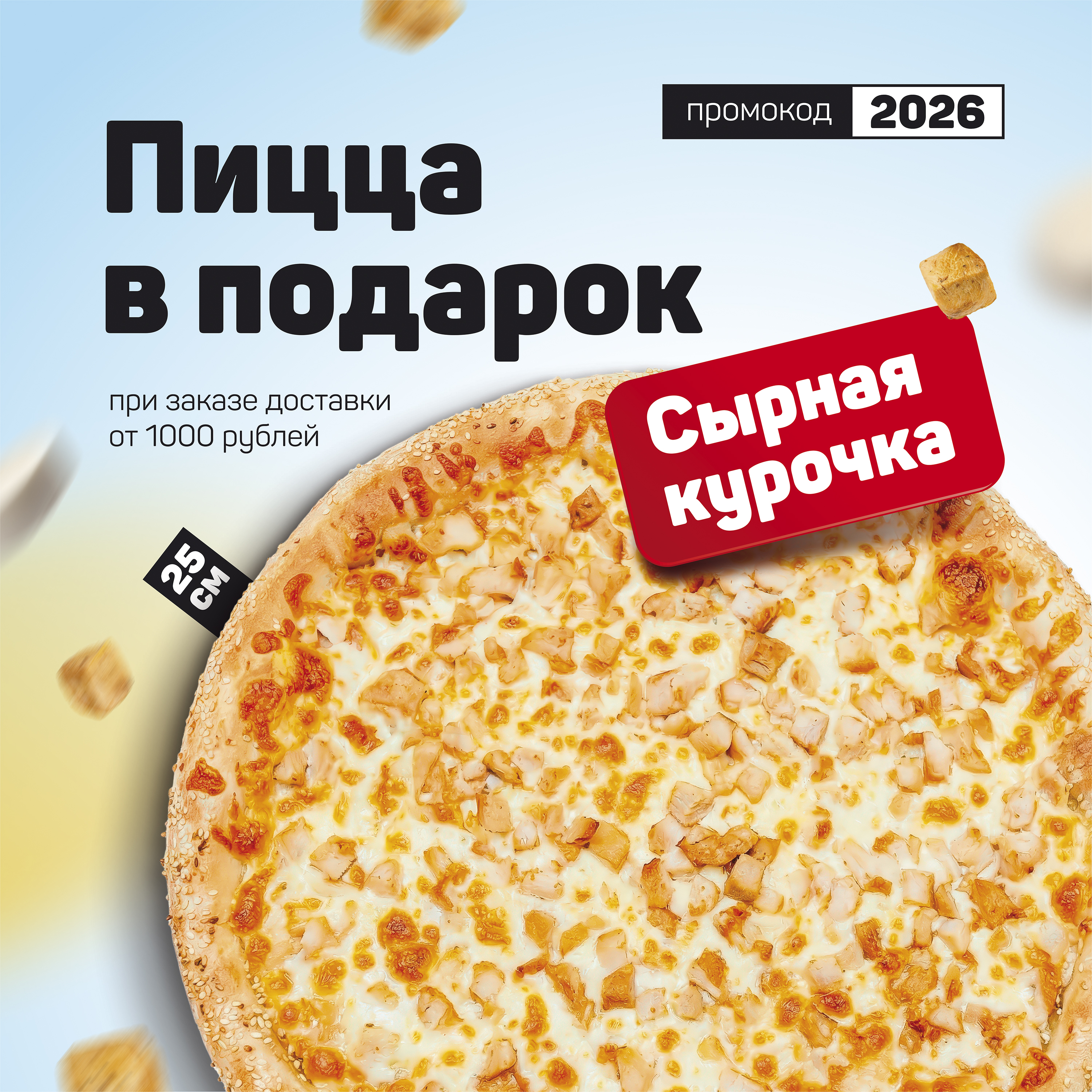- При заказе от 1000 рублей, пицца Сырная курочка 25 см в подарок.